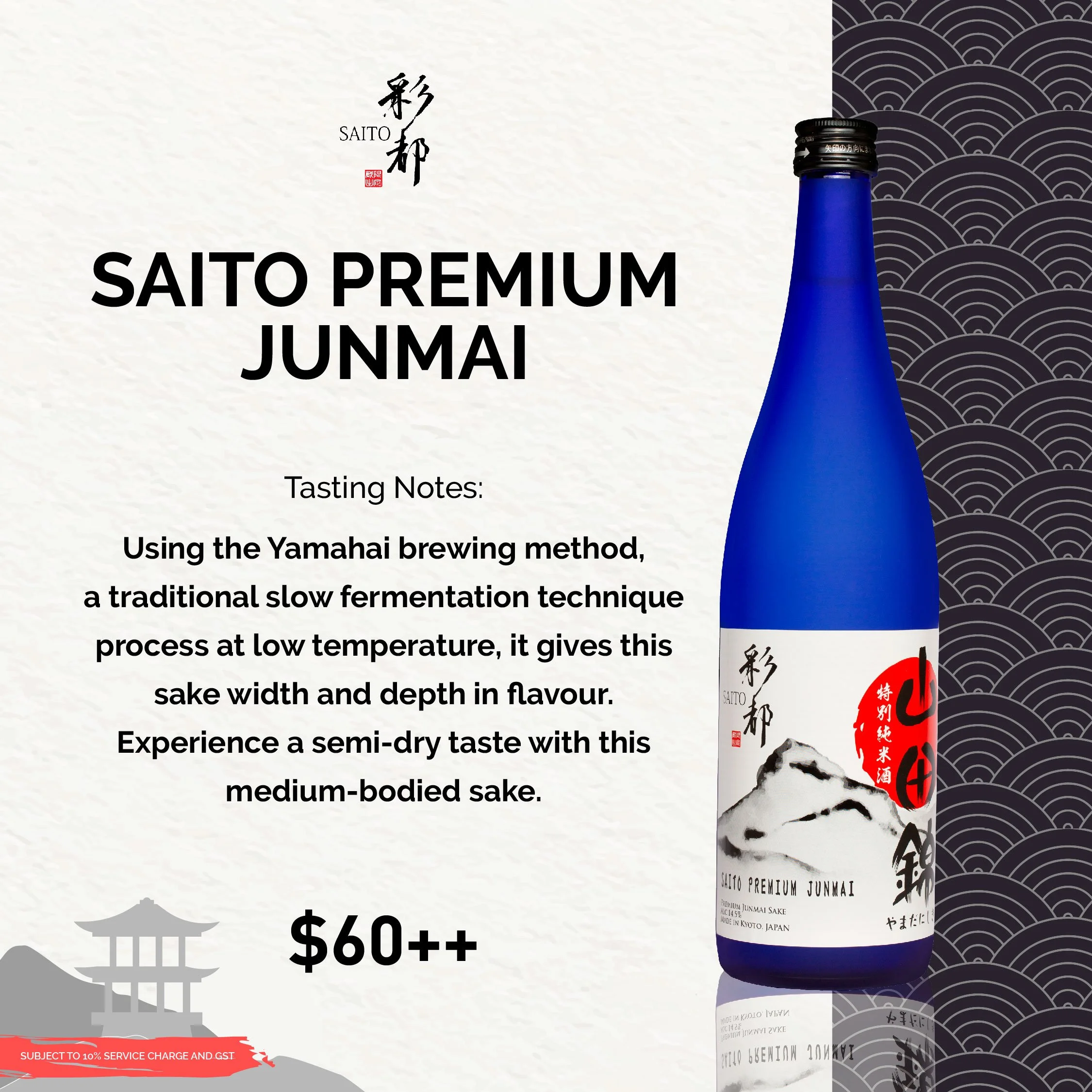 Saito Premium Junmai - Crisp and clean with a Mild touch of mushroom and starch, a wonderful match for fried seafood dishes.