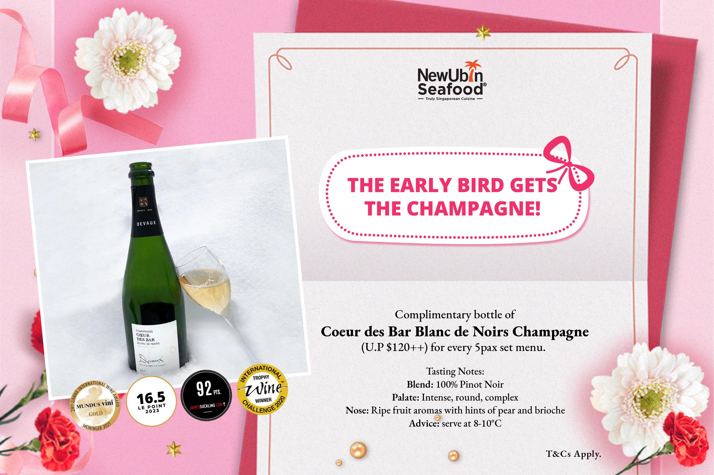 30% discount on Set menu with Grab Dine-in payment + Free bottle of Cœur des Bar Blanc de Noirs Champagne* applicable only if you book and make payment during Early Bird period.