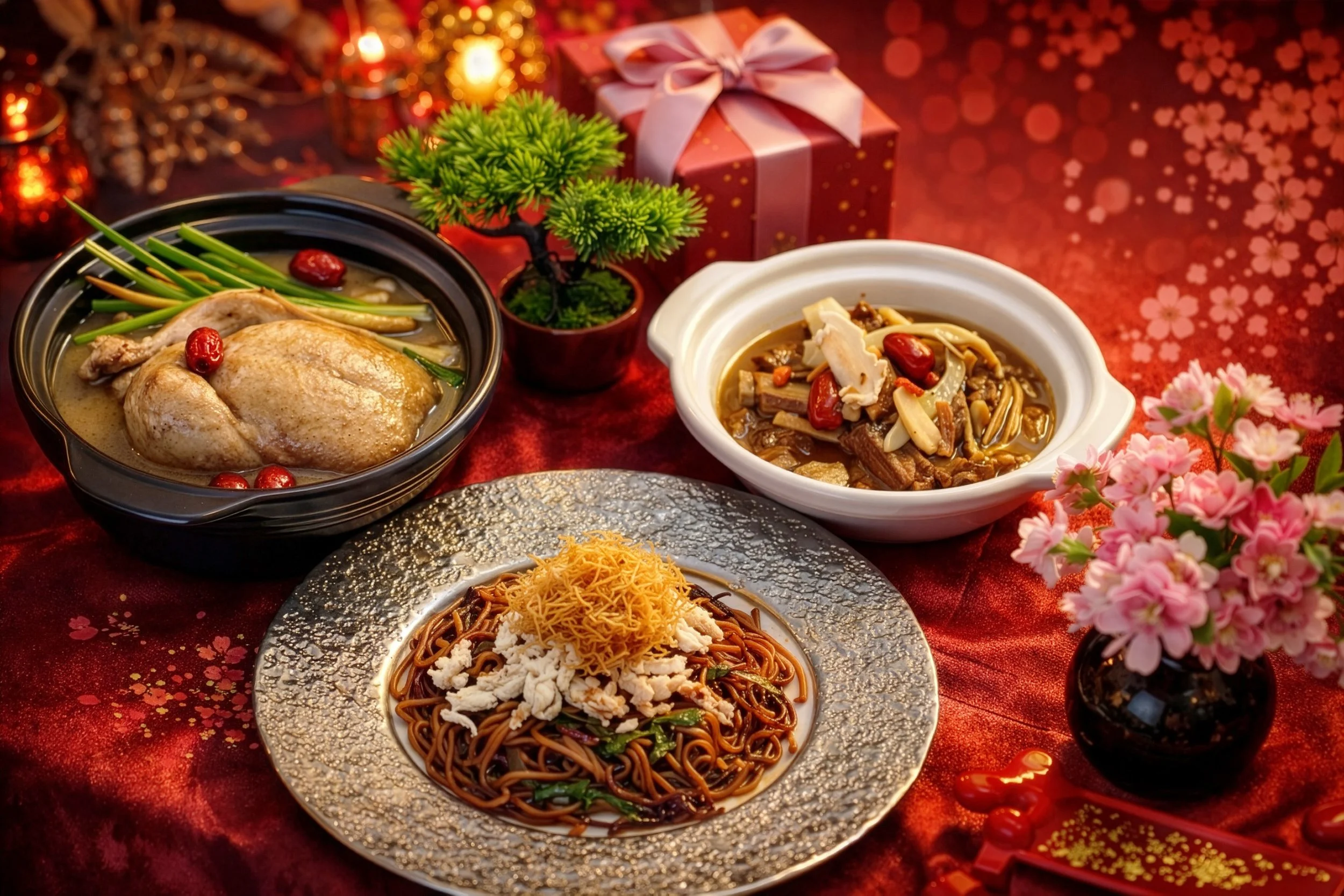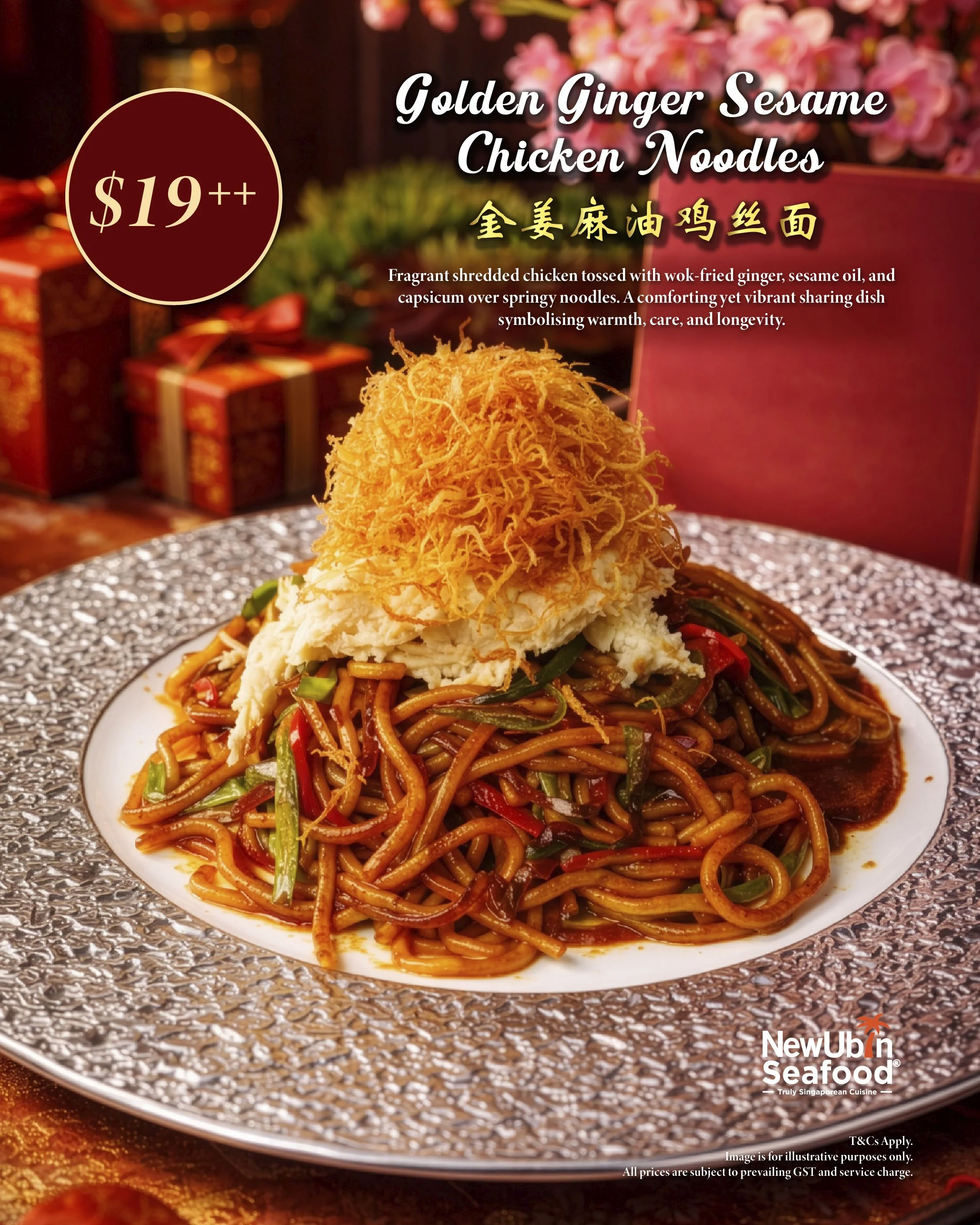 Fragrant shredded chicken tossed with wok-fried ginger and sesame oil over springy noodles. A comforting dish symbolising warmth and longevity.