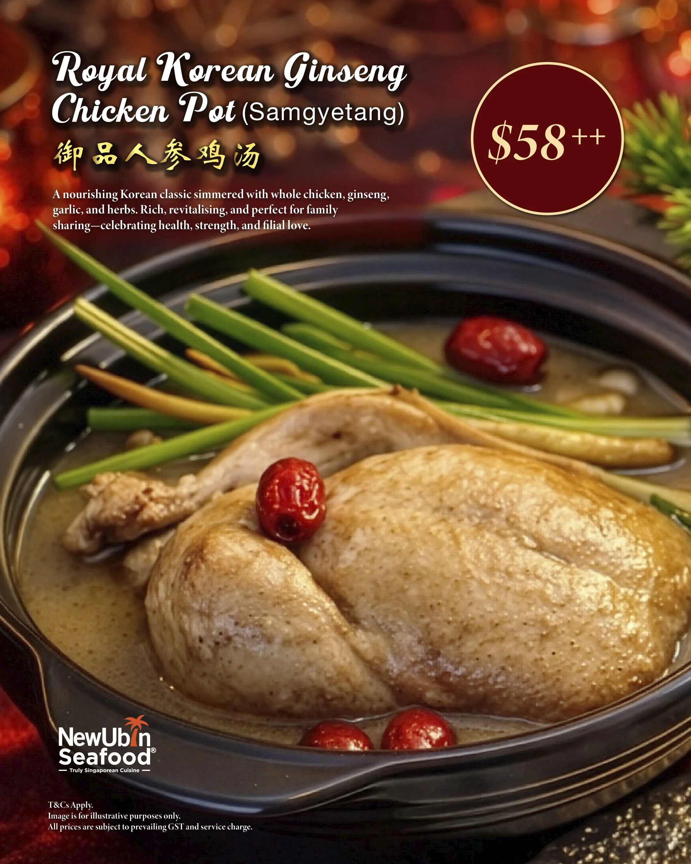 A nourishing classic simmered with whole chicken, ginseng, garlic and herbs. Perfect for strength, vitality, and family sharing.